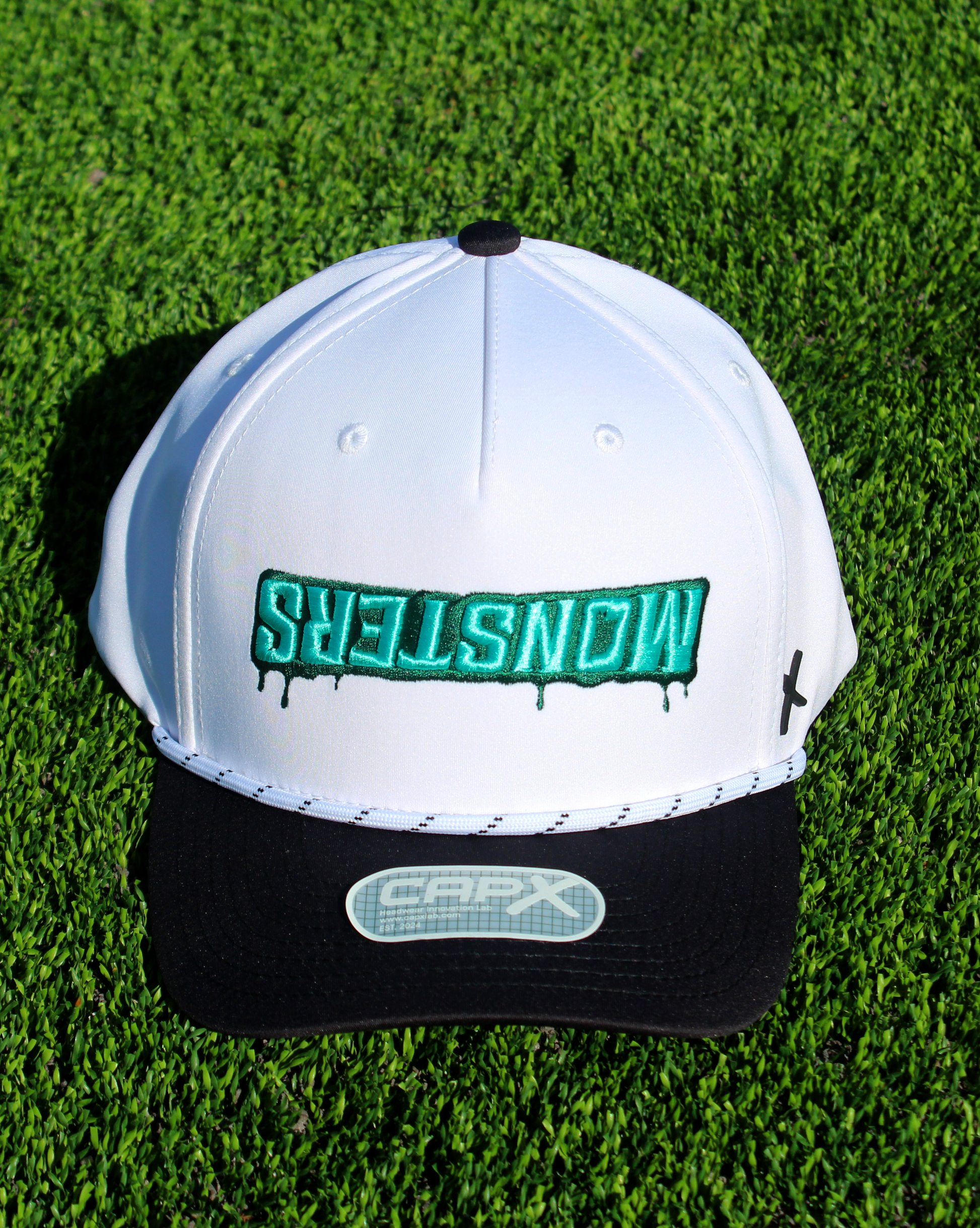 The Inverted Monsters Logo Hat - White/Black features a crisp white crown paired with a black bill, a rope front detail, and an upside-down embroidered Monsters wordmark across the front. The inverted logo is intentional, giving this hat a bold, modern edge that stands out without trying too hard.